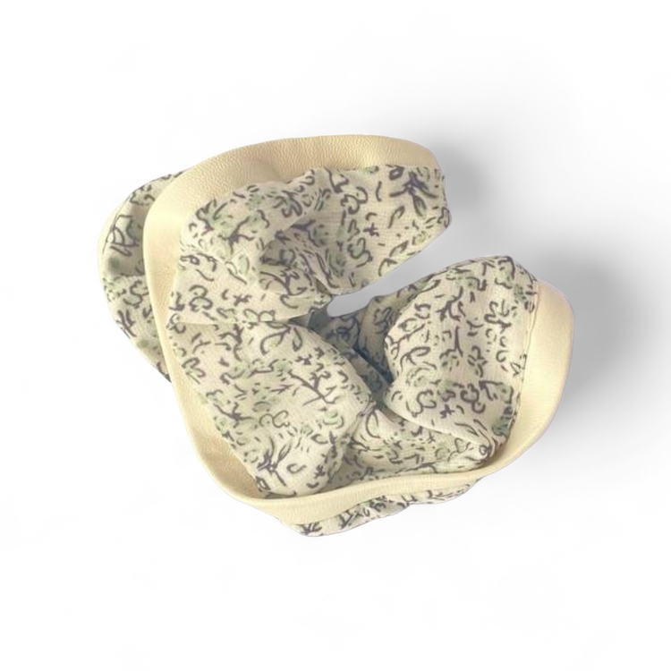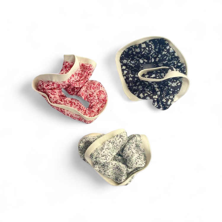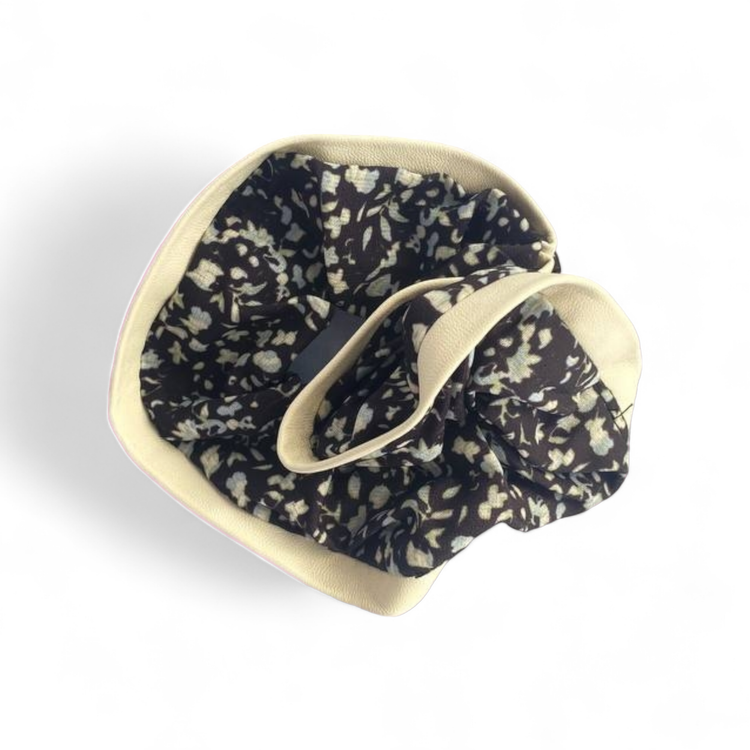 اسکرانچی پارچه ای با طرح گلهای ریز و لبه چرمی سفید