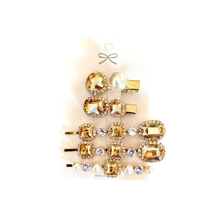 اگر به دنبال اکسسوری مویی هستی که هم چشمگیر باشه و هم کاربردی، این ست ششتکه گیرهی نگیندار، انتخابی بینقص برای توئه. هر کارت شامل سه گیره انبری بلند و دو انبری کوتاه است که همگی با سنگهای کریستالی براق، نگینهای اتمی درخشان و مرواریدهای ظریف تزئین شدن. پایهی طلایی این گیرهها از فلز با رنگ ثابت ساخته شده که در برابر رطوبت و استفادهی مکرر مقاومه.