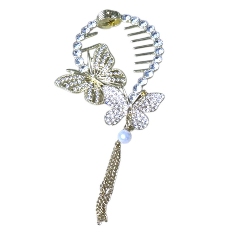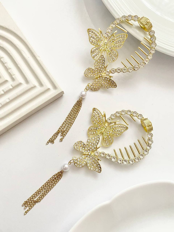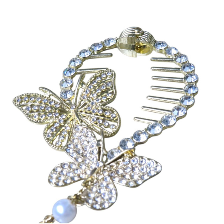 این گیره مو با بدنه فلزی طلاییرنگ ساخته شده و با نگینهای درخشان کار شده که زیر نور برق ظریفی دارن. دو پروانهی نگینکاریشده با جزئیات ظریف، جلوهای زنونه و لطیف بهش دادن و آویز مروارید و زنجیر طلایی، حرکت و ظرافت بیشتری به استایل اضافه میکنه.