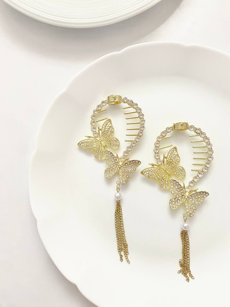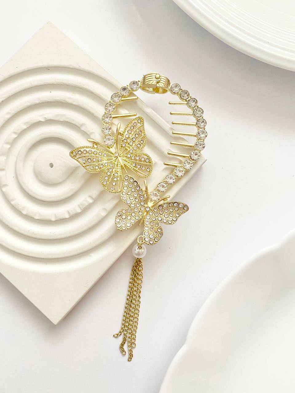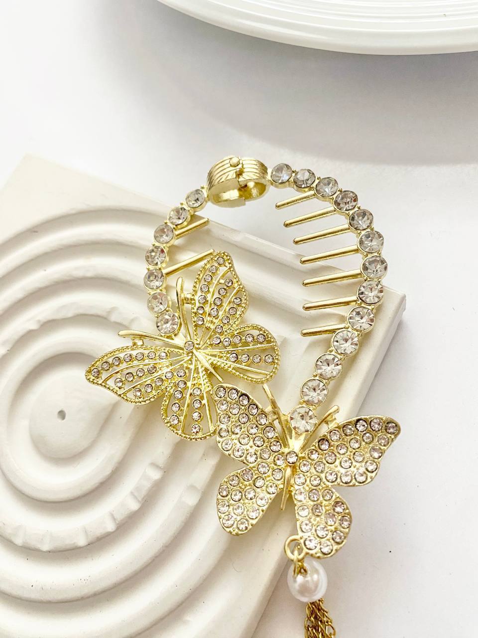 این گیره مو با بدنه فلزی طلاییرنگ ساخته شده و با نگینهای درخشان کار شده که زیر نور برق ظریفی دارن. دو پروانهی نگینکاریشده با جزئیات ظریف، جلوهای زنونه و لطیف بهش دادن و آویز مروارید و زنجیر طلایی، حرکت و ظرافت بیشتری به استایل اضافه میکنه.