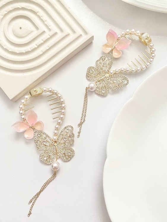 گیره گوجه ای فلزی گلدار با پروانه صدفی صورتی | نگیندار و مرواریدی، فوقالعاده باکیفیت ✨