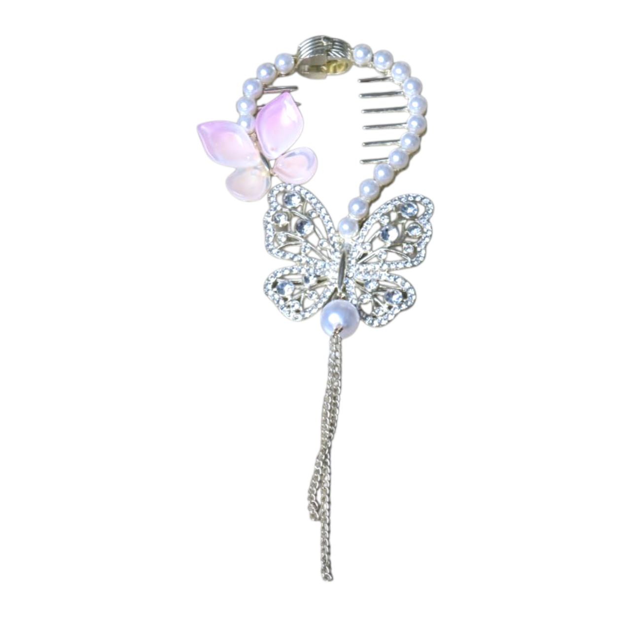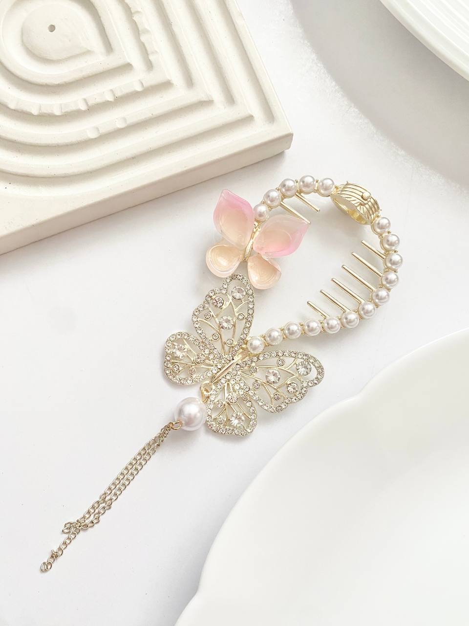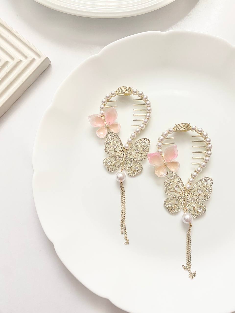 گیره گوجه ای فلزی گلدار با پروانه صدفی صورتی | نگیندار و مرواریدی، فوقالعاده باکیفیت ✨