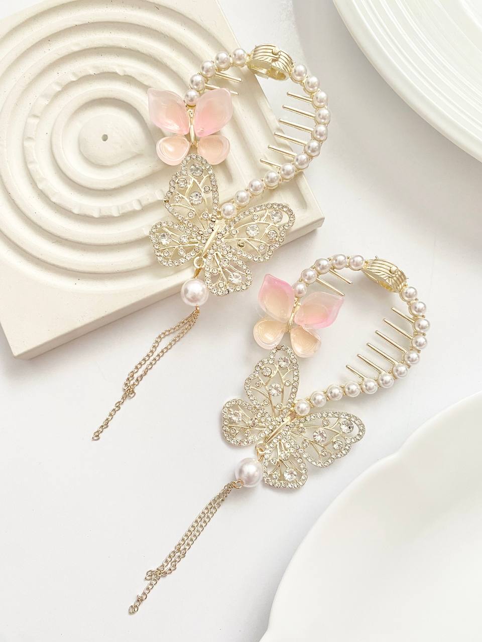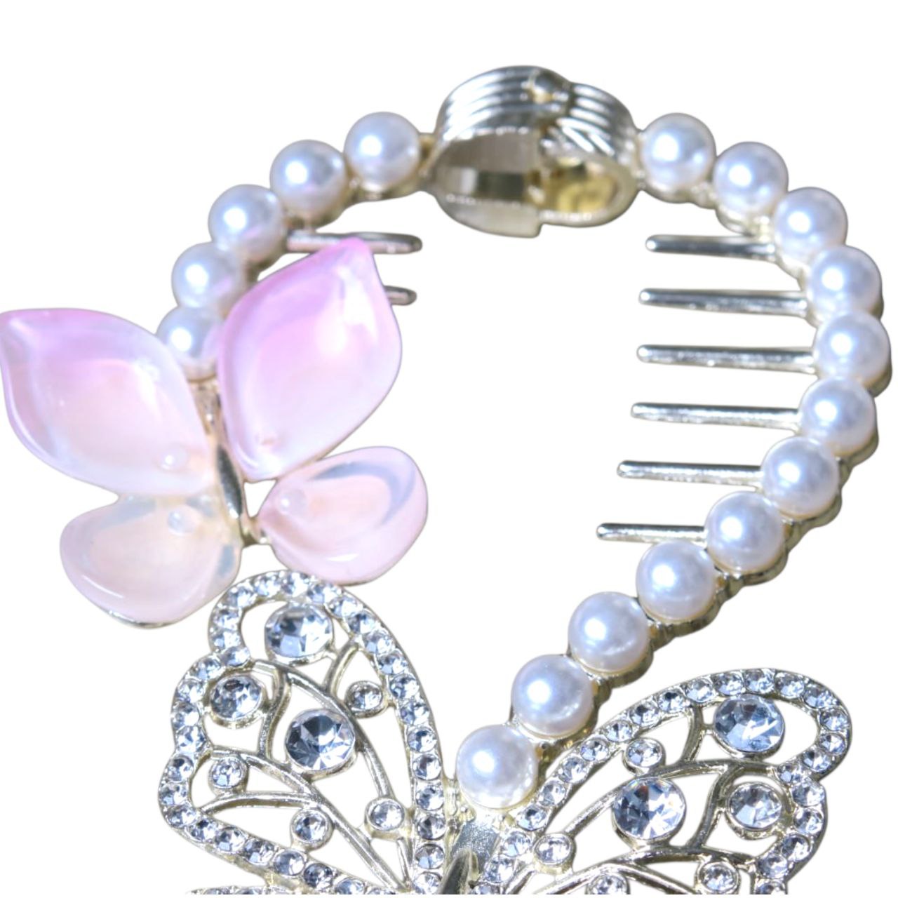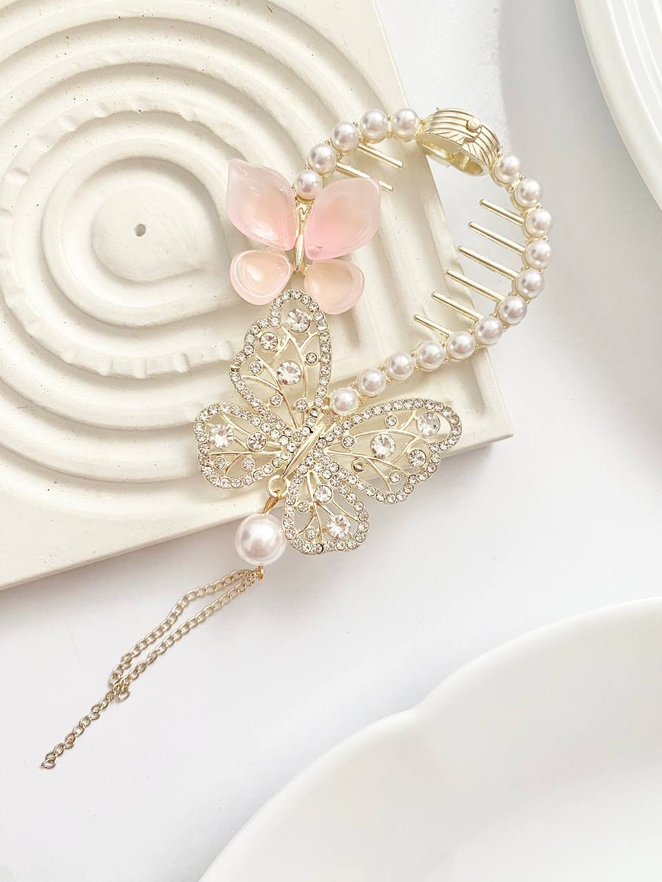 گیره گوجه ای فلزی گلدار با پروانه صدفی صورتی | نگیندار و مرواریدی، فوقالعاده باکیفیت ✨