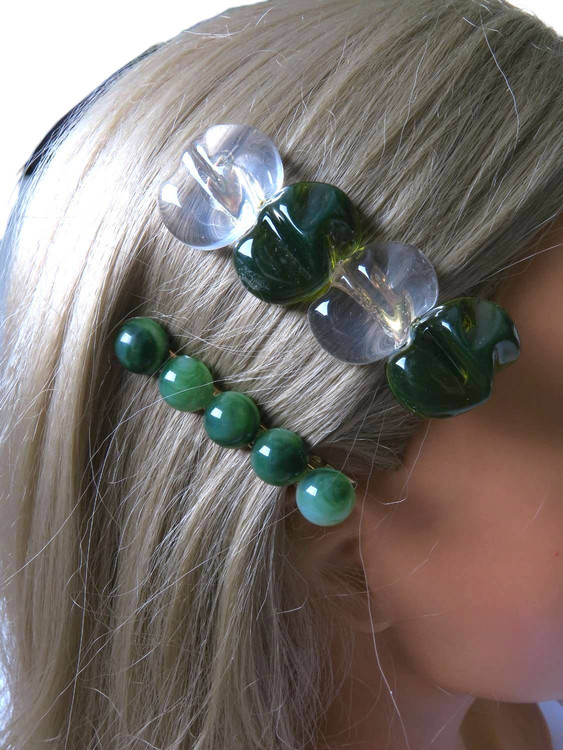 • یکی مدل بالاست: چهار تا مهره بزرگ و خاص با رنگ سبز زیتونی و سفید شیری که توش برق طلایی و نقرهای میزنه. طراحی هنری و متفاوتش خیلی خاصه. • مدل پایینش هم پنج تا مهره گرد و براق سبز تیره که حسابی شیک و کلاسیکه.